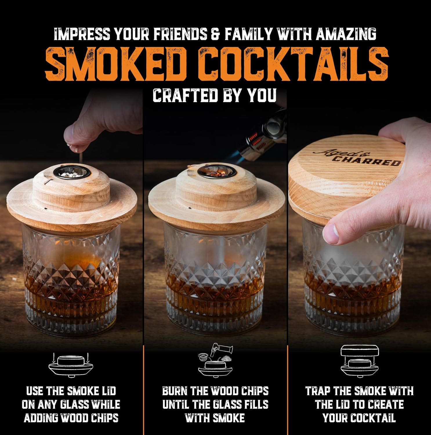 - Premium Whiskey Smoker Kit - Our complete cocktail smoker kit includes a 100% USA Oak Smoke Lid, 8 premium wood chip flavors (oak, cherry, apple, hickory, mesquite, peach, pecan, hickory), a high-end culinary torch, and 75ml (2.5 fl oz) of butane. This old fashioned smoker kit is perfect for immediate use and enhances any whiskey or cocktail experience. Perfect Whiskey Gifts / Whiskey Gift.