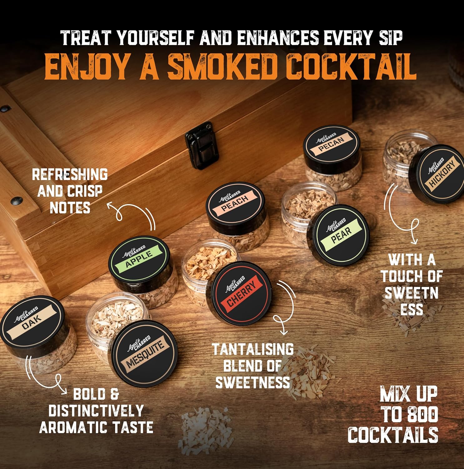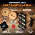 - Exceptional Flavor Profiles - Experience the diverse and rich flavors of oak, cherry, apple, and hickory wood chips included in this whiskey smoker kit. Perfect for creating unique, smoky tastes in your old fashioned cocktails and other favorite drinks.